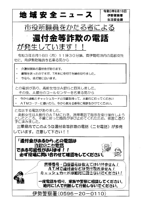 8月21日、市役所職員をかたる男から特殊詐欺の電話が発生しました。身に覚えのない内容であれば、まず1度電話を切って伊勢警察署にご相談ください。