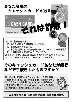 被害者は玉城町地内に住む高齢者で、犯人は電話で伊勢警察署員を名乗り、自宅訪問の上、キャッシュカードとポイントカードをすり替えて暗証番号を聞き出す手口を使用しています。